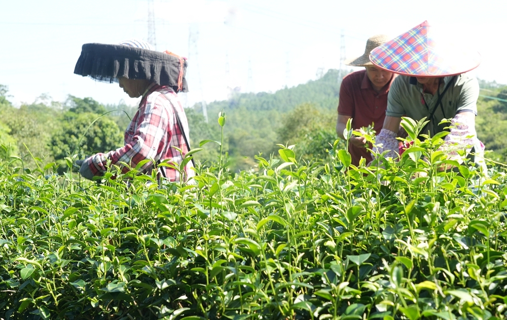 惠东县生态绿茶园里,满是蓬勃生机。茶农们头戴遮阳帽,在层层叠叠的茶树间穿梭,指尖轻捻,将鲜嫩的茶芽采下。不远处,刚采下的茶叶被小心翼翼放置在竹制的器具里,正有序进行着摊晾等工序,每一片茶叶都似蕴含着茶园的清新与茶农的匠心,静静等待着蜕变,化作香茗,传递悠悠茶韵。