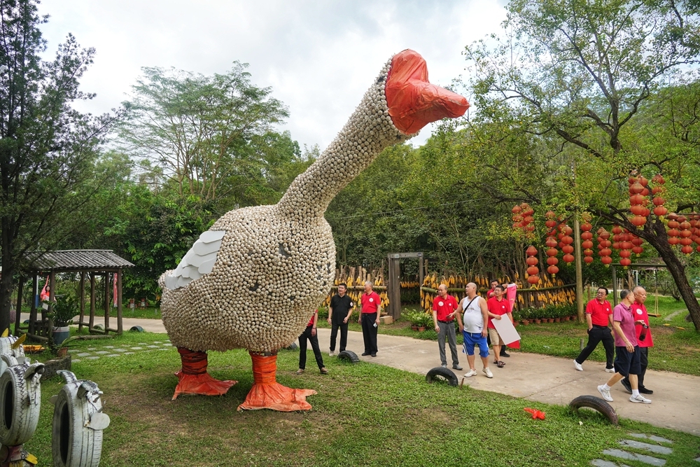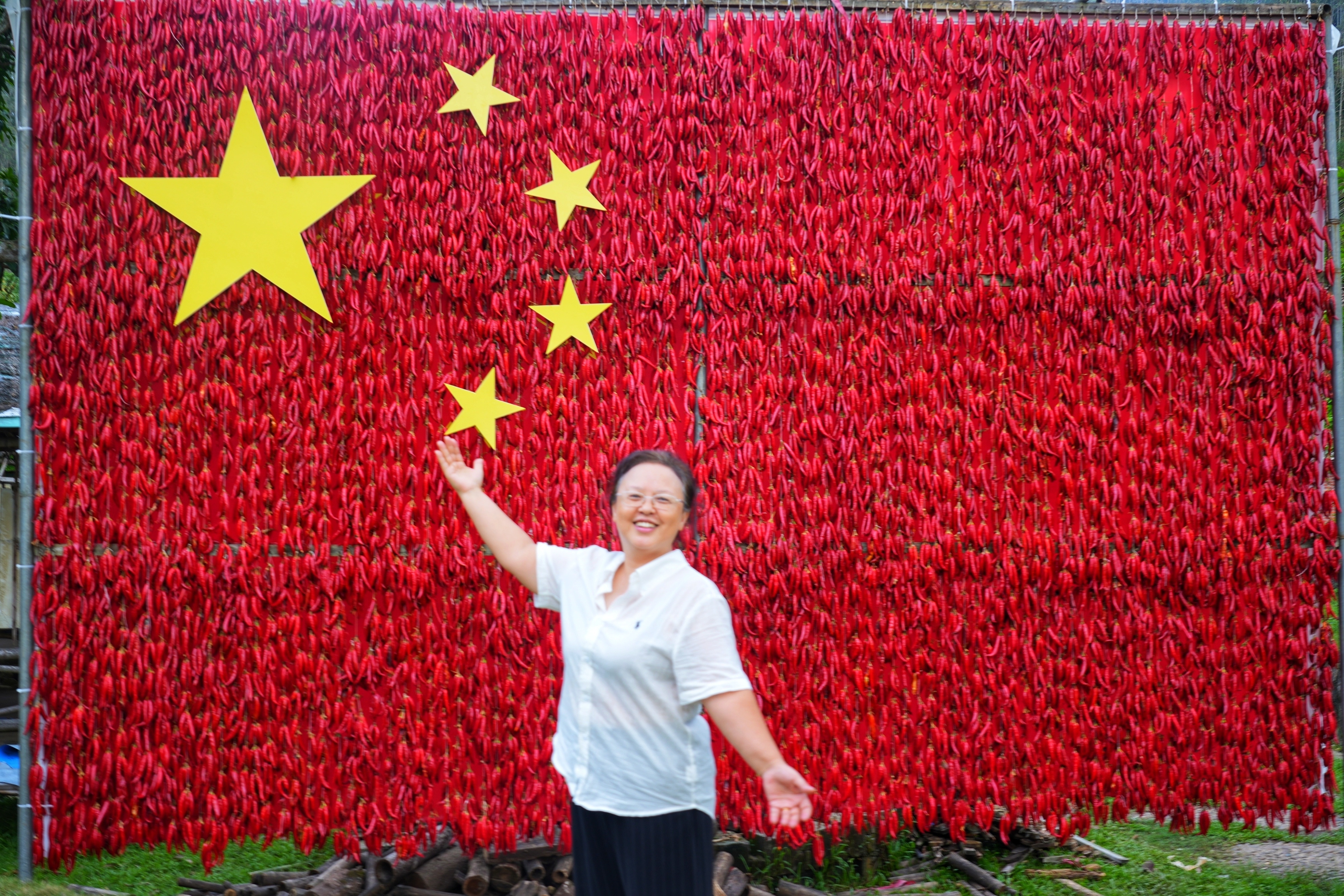 而在“山里头农场”,一场别开生面的丰收艺术季正在上演。一颗颗大蒜垒成憨态可掬的大白鹅,仿佛从田园童话中踱步而出;一串串火红的辣椒“绣”成巨幅国旗,映照出人们心中那一抹炽热的“中国红”;金黄的玉米墙、橙红的南瓜阵……丰收的农作物在这里“变身”艺术装置,以最质朴的方式,在山谷间铺展出一幅浓烈而温暖的秋收画卷。